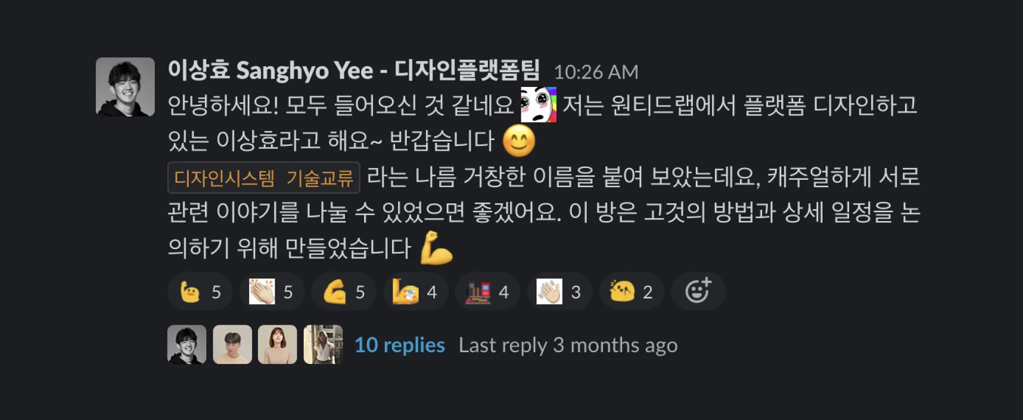 디자인 시스템을 만들다 보면 다양한 시행착오도 함께 생기게 되는데요, 그러던 와중 ‘다른 곳에서는 어떻게 시스템을 만들고 발전시키고 있을까?’ 라는 궁금증이 들었어요. 이런 의문은 원티드 플랫폼 디자이너만 갖고 있던 것은 아니었고, 이에 당근마켓의 플랫폼 디자이너분들과 의기투합해 교류 세션을 갖기로 했습니다.