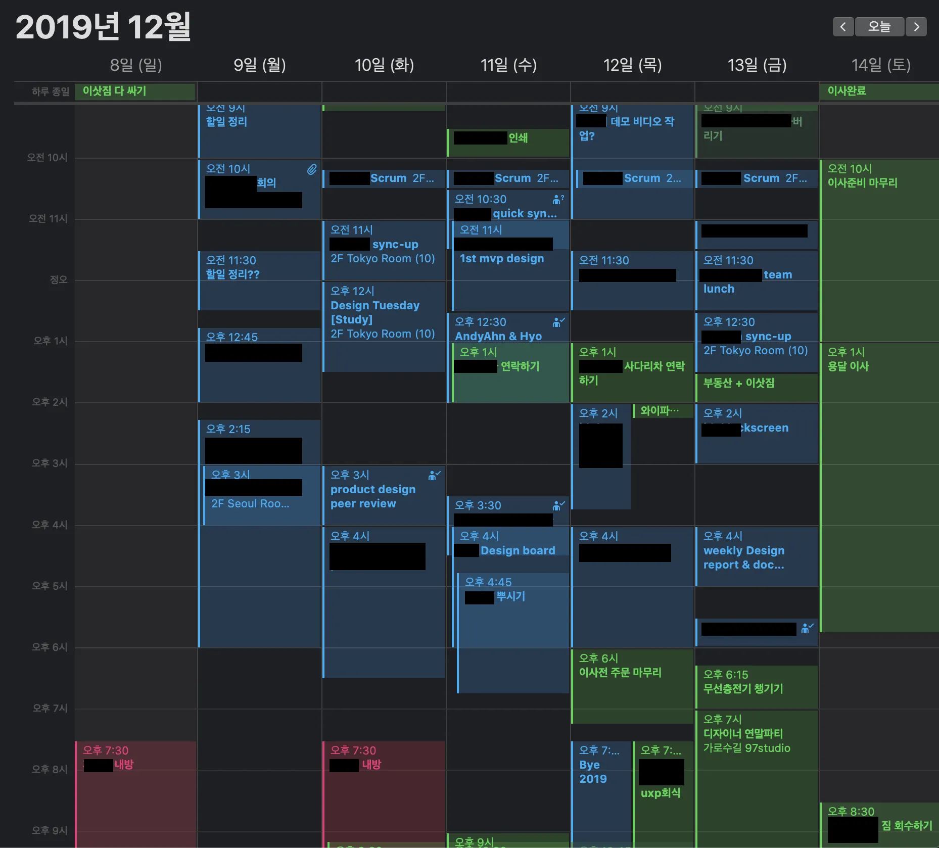 저는 2015년부터 일정을 애플 제품으로 관리하고 있어요. 위 스크린샷은 MacOS 애플 캘린더 UI입니다. 2019년 12월 당시 이미 하고 있던 방식을 정리하면 크게 다음과 같이 요약할 수 있을 것 같아요.