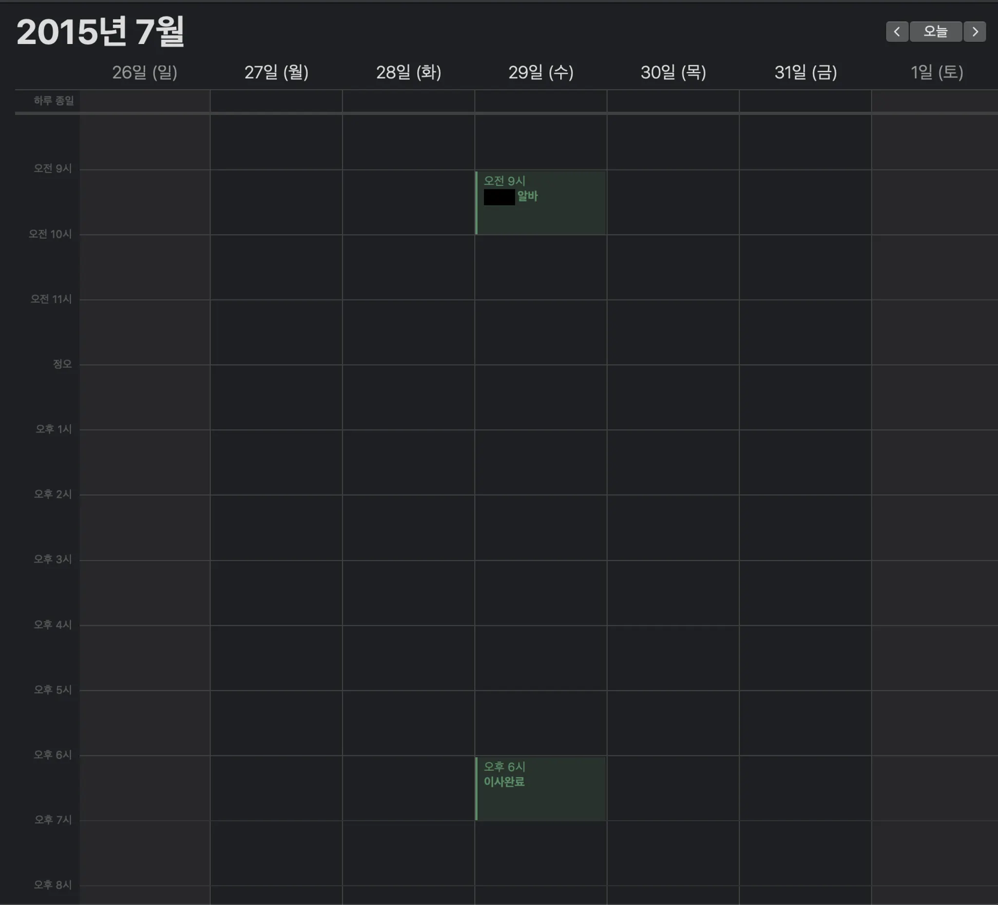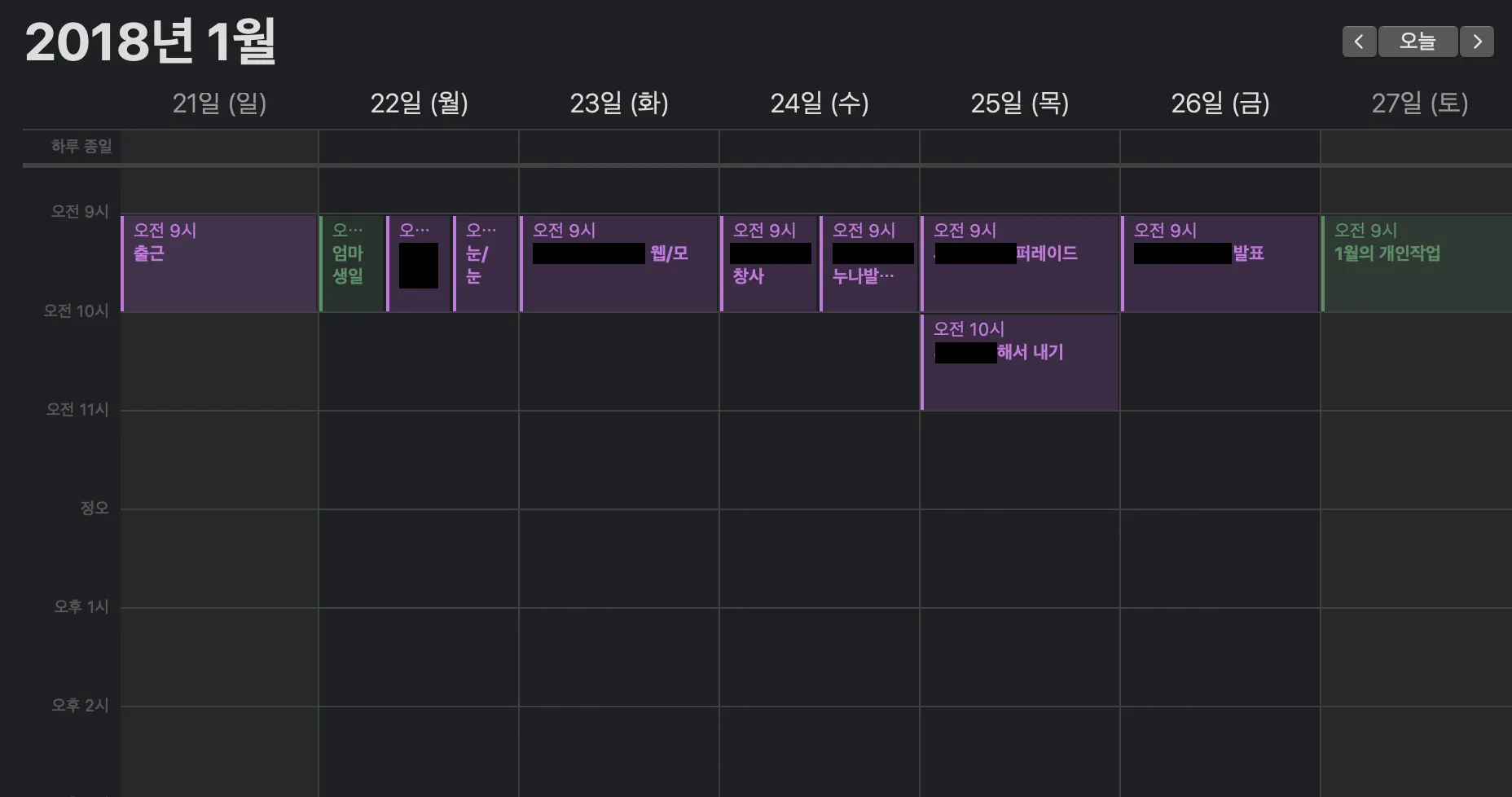 맥북 캘린더는 시간 설정을 하지 않으면 기본적으로 오전9~10시로 일정이 잡히기 때문에, 단순 일별 메모장처럼 사용하면 아래와 같은 그림이 그려집니다.