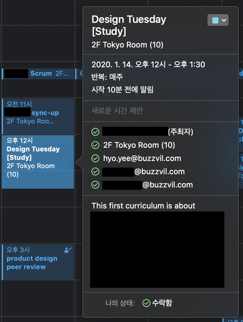 반복 일정, 비공개 일정, 휴가 일정 등 다양한 추가기능을 제대로 사용하게 되었어요.