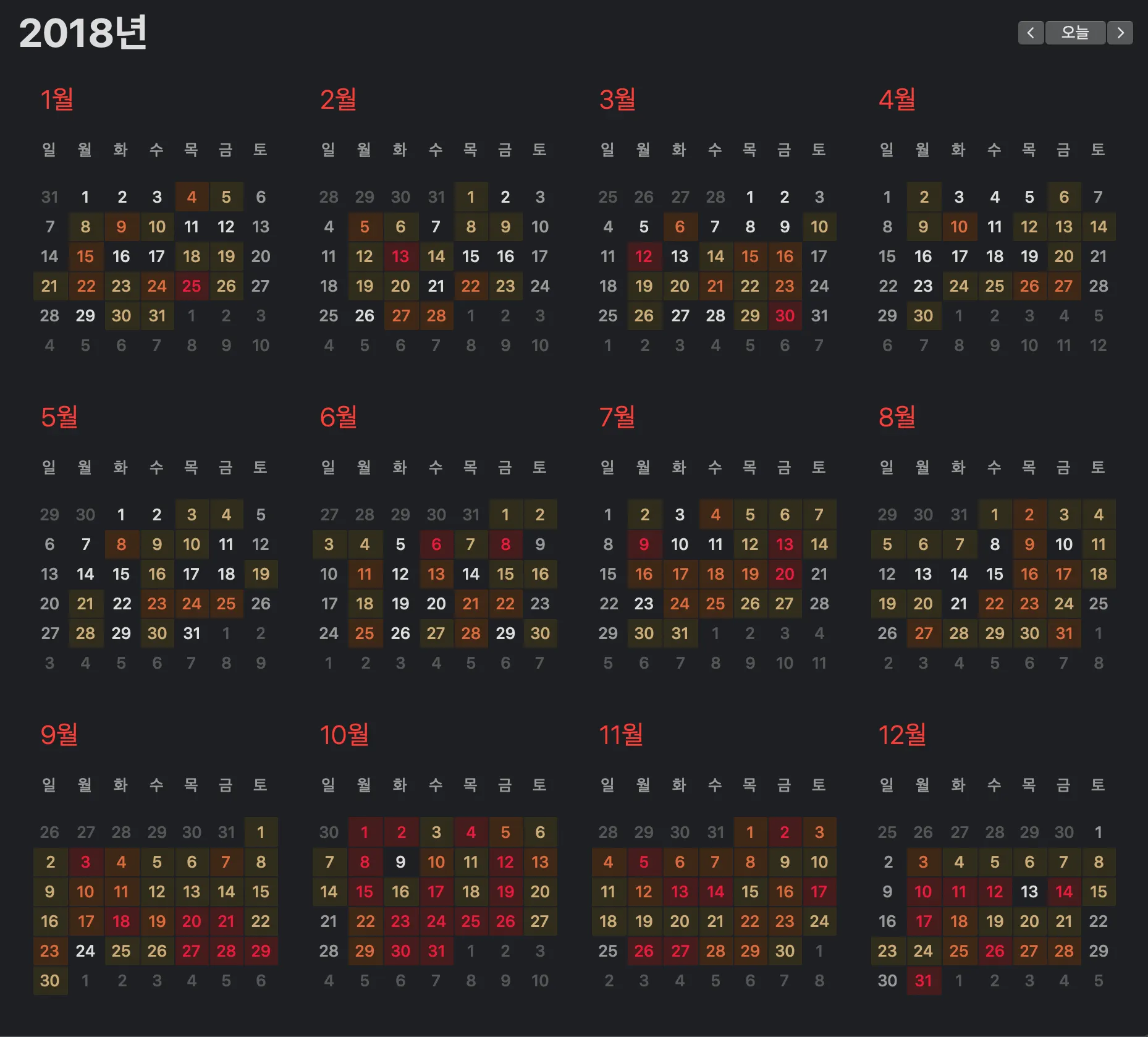 애플 캘린더를 연도별로 확인하면, 일정의 수에 따라 박스가 쳐진 모습을 볼 수 있어요.