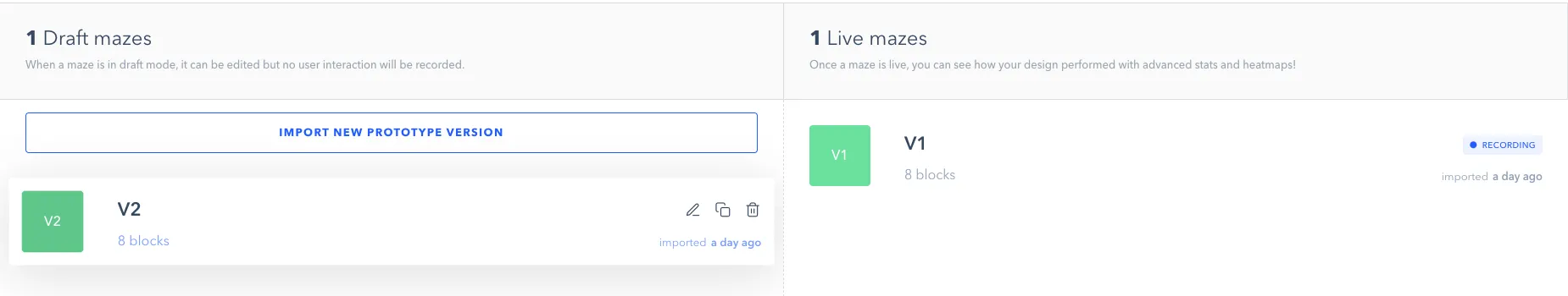 1프로젝트 내에서라면 (프로토타이핑 링크 하나를 활용하는 것이라면) 얼마든지 새로운 버전을 만들어 테스트 플로우를 수정하고 재배포할 수 있어요. 소규모 인원에게 테스트를 먼저 진행하고 이후 개선된 사항으로 대규모 설문 배포를 진행하는 전략을 짤 수 있습니다. 저도 해당 기능을 활용해 팀내 2~3명에게 우선 피드백을 받고, 개선된 플로우로 대규모 배포를 계획하고 있어요.