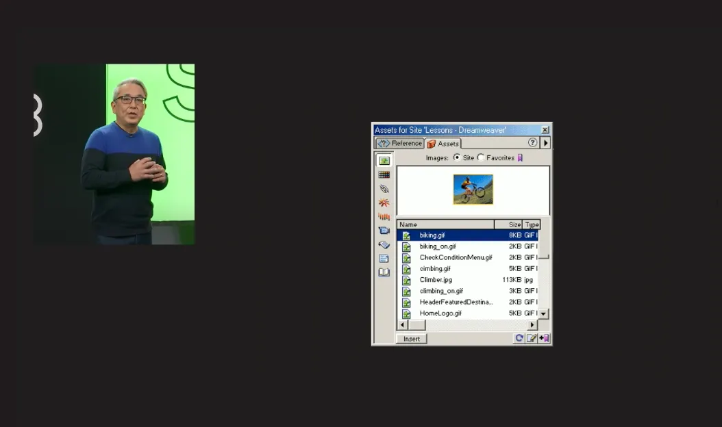보시는 화면은 드림위버의 에셋 패널인데요, 이런 식으로 사람들은 통일성을 위해 예전에 썼던 걸 다시 쓰고 싶어했어요. 이걸 보여주는 이유는.. 원초적인 디자인 시스템의 기원에 대해 얘기하고 싶어서입니다.