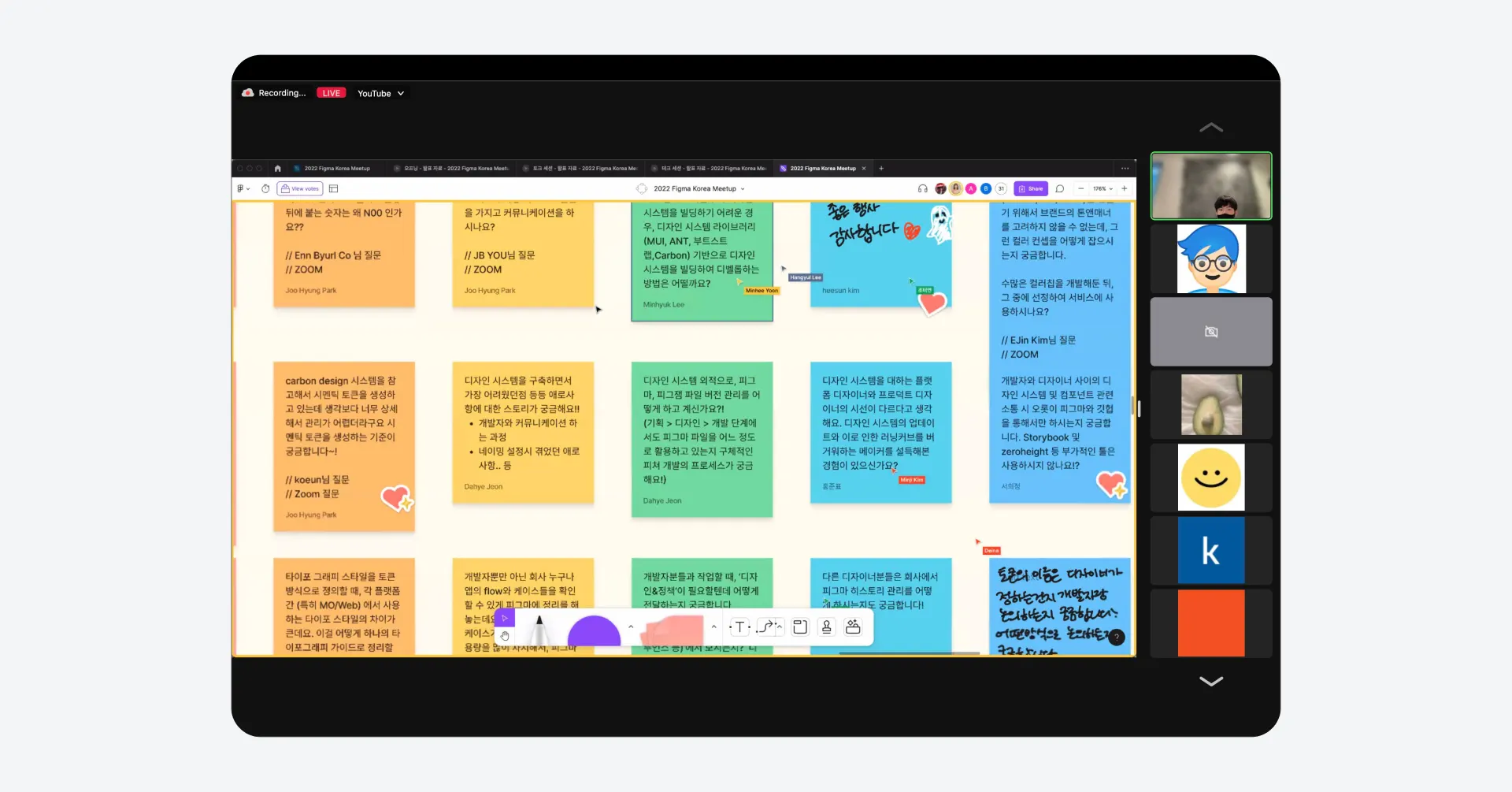 피그마의 강점 중 하나인 실시간 협업 기능을 십분 활용할 수 있도록, Q & A를 피그잼으로 구성해보기로 했습니다. 이는 결과적으로 매우 즐거운 비주얼(모두가 참여하는 느낌의, 피그마라는 툴 성격에 부합하는)을 만들어 주었다고 생각하고, 다양한 분들의 많은 질문을 접할 수 있었던 소중한 시간이었던 것 같습니다.