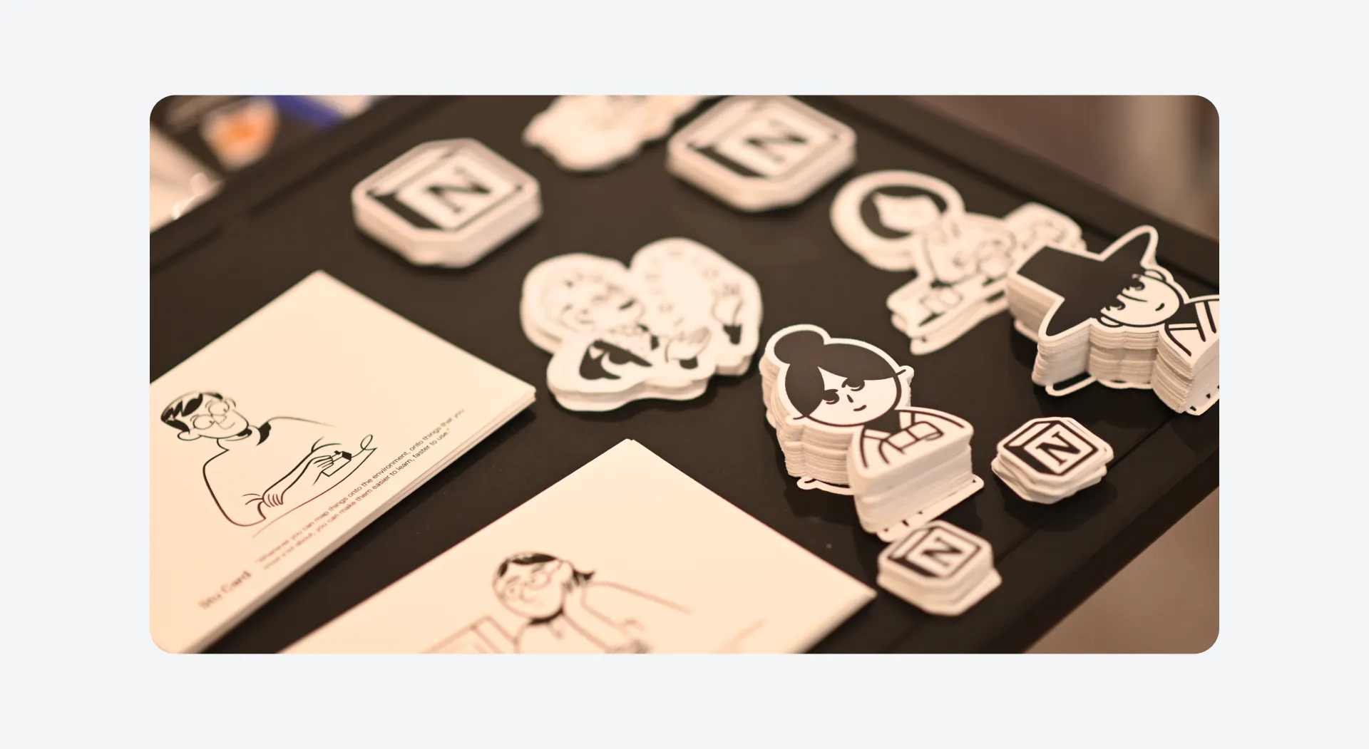 우선 주관사인 노션, 로티파일즈, 원티드 세 곳의 굿즈를 빠르게 요청했습니다. 본사가 외국에 있는 기업의 경우 해외 배송으로 인해 시간이 더 오래 걸릴 수 있다고 생각했기 때문에, 속도감 있게 굿즈 관련 준비를 마무리해야 했습니다. 다행히 제때 도착해 더욱 풍성한 행사 분위기가 조성되었던 것 같아요. 특히 노션의 경우 한복을 입은 커스텀 스티커를 준비해주신 점이 인상깊었습니다. 정말 급하게 요청드렸는데도 멋지게 준비해 주신 로티파일즈, 원티드랩 크리에이티브 팀에도 감사 인사를 드립니다.