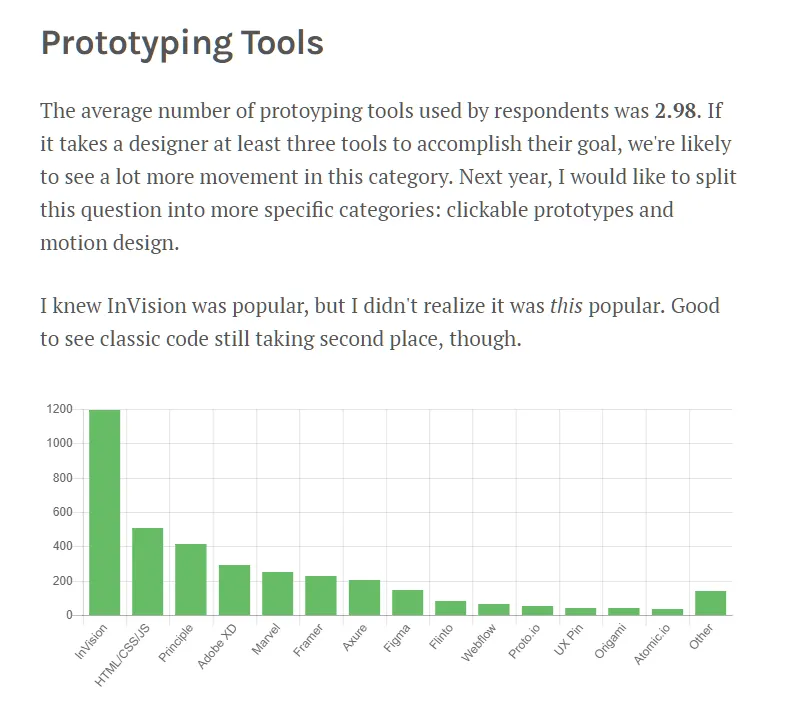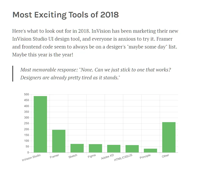 인비전 스튜디오가 2018년 가장 기대되는 툴로 선정되었기 때문입니다. 저도 개인적으로 큰 기대를 하고 있는 툴이기도 하고요 나와 같은 역할과 업무를 담당하는 사람들이 어떤 툴을 활용해 작업을 하는지 살펴보는 일은 흥미로우면서도 많은 도움이 되는 것 같습니다. 저는 기획자로 일을 하고 있지만, 기획자에게도 익숙한 툴들이며, 실제로 업무 진행 시 활용하고 있는 툴들이 많이 언급되었기에 더 재미있었습니다. 설문에 대한 전체 내용은 이 곳에서 확인이 가능하니 참고해주세요!