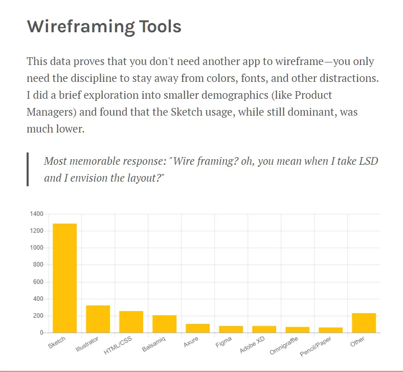 디자이너들이 상황별로 활용한 디자인 툴에 대해 조금더 자세히 들여다봤습니다. 와이어프레임의 경우 앞서 말씀드렸던 것처럼 스케치가 압도적인 1위를 찾이했는데요! 2위가 어도비의 일러스트레이터였습니다. 스케치와 어도비의 차이는 5배 정도..!