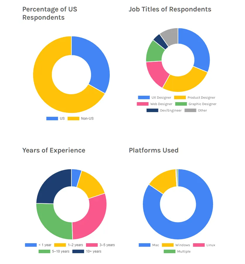 더 자세한 설문 내용을 확인하기 전, 국가별 응답 비율이 궁금했는데요.미국이 가장 많았고, 독일과 영국, 캐나다와 프랑스가 그 다음이었습니다. 100여개 이상의 국가에서 설문에 참여했다고 하니, 설문 결과가 더욱 흥미롭게 다가왔습니다.(물론 미국이 1/4을 차지했지만요) 응답자들의 세부 작업 환경도 살펴볼 수 있었는데, 사용자경험 디자이너, 제품 디자이너와 웹 디자이너의 비중이 2/3를 차지했고 사용하는 OS의 경우 맥이 70% 이상을 차지하고 있었습니다. 디자이너와 애플의 궁합을 다시 한 번 확인할 수 있었네요.
