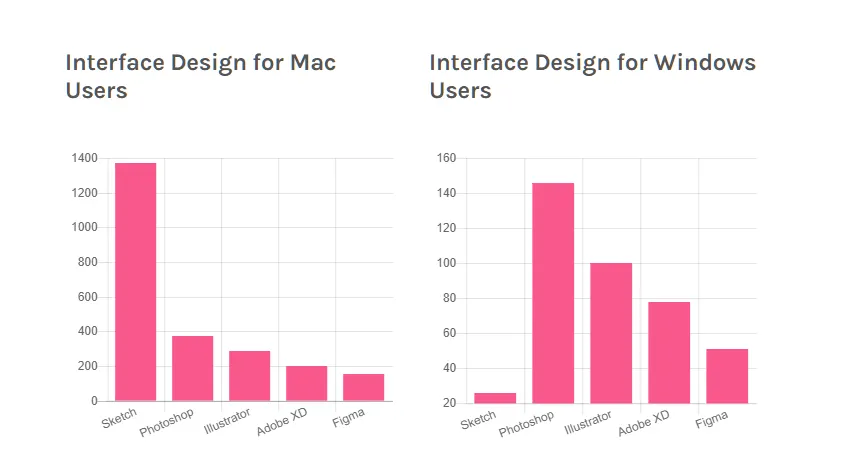 설문 결과를 살펴보다 가장 재미있었던 부분은 바로 활용하는 OS에 따른 인터페이스 디자인 툴에 대한 내용이었습니다. 맥을 쓰는 유저들의 경우 스케치를 가장 많이 활용하고 있었고, 윈도우를 쓰는 유저들의 경우 포토샵과 일러스트레이터를 가장 많이 활용하고 있었습니다. XD도 결과에 포함되어 있고요. 아무래도 스케치를 윈도우에서 쓸 수 없기에 이런 결과가 나온 것 같습니다만, XD의 경우 포토샵과 일러스트레이터에 밀려 윈도우 유저들에게도 힘을 쓰지 못한다는 점이 인상적이었습니다.