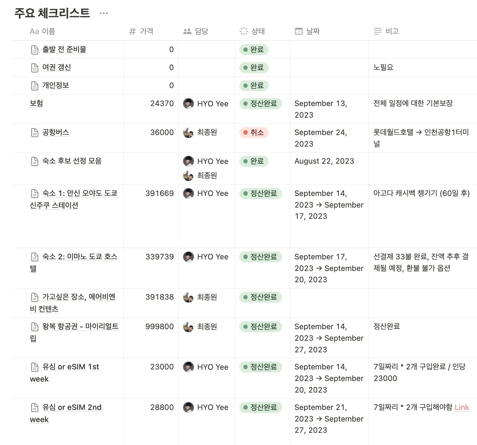 개인적으로 2주 간 항공료, 숙박료, 기념품, 관광비, 술값 전부 포함 270만원 정도 사용했다. (노션 정산내역 스샷으로 추가)